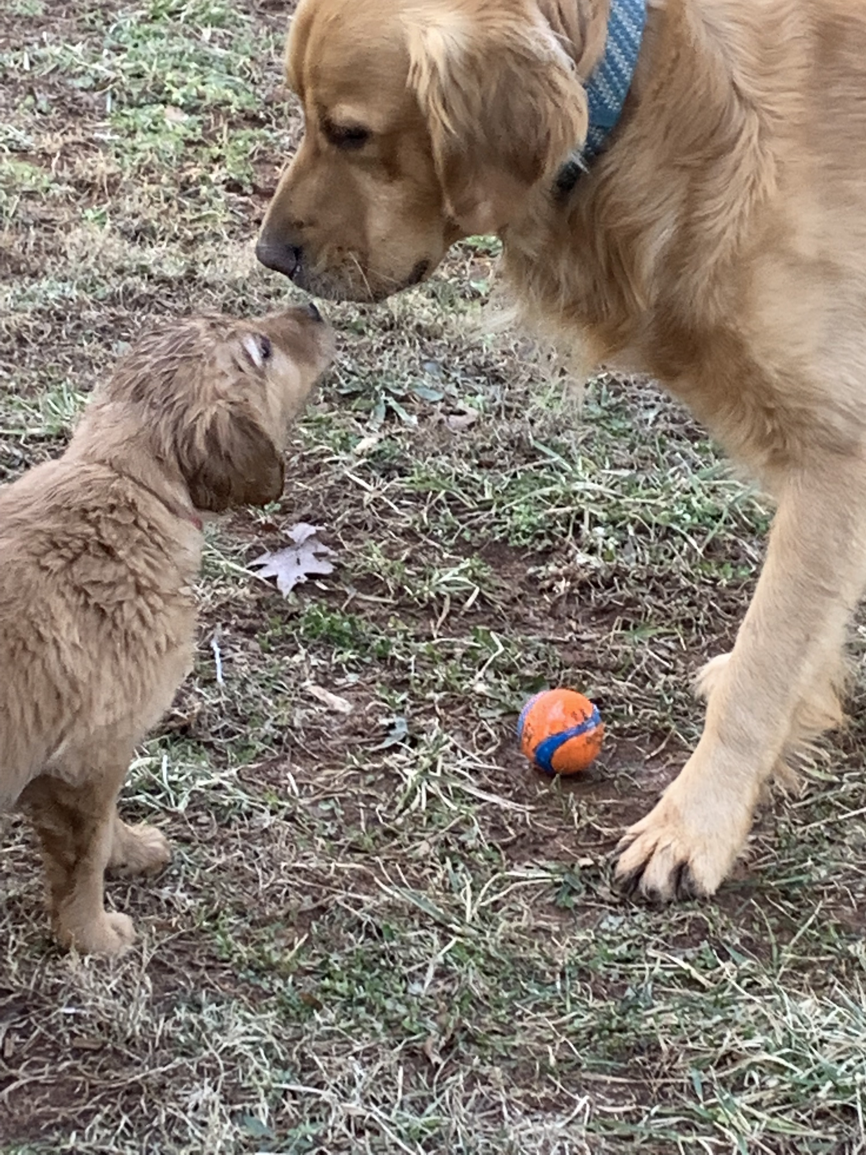 I smelled change in the wind as my family returned at last from a long day away from home. As my whole family came into my fence, I saw Daddy carrying something small, brown, and wriggly in his arms. After Daddy set the tiny creature down, I began my investigation of the furry bundle. I soon realized two things; It’s a puppy and a friend for me to play with! It’s a girl and her name is Ruth. She is a fierce little force to be reckoned with and has sharp teeth! Later, when it was time for bed, Ruth tried to hide under my bed and kept doing sneak attacks. Although I couldn’t be happier to have a new friend, I do wish she would quit attacking my tail because her teeth are really rather sharp!