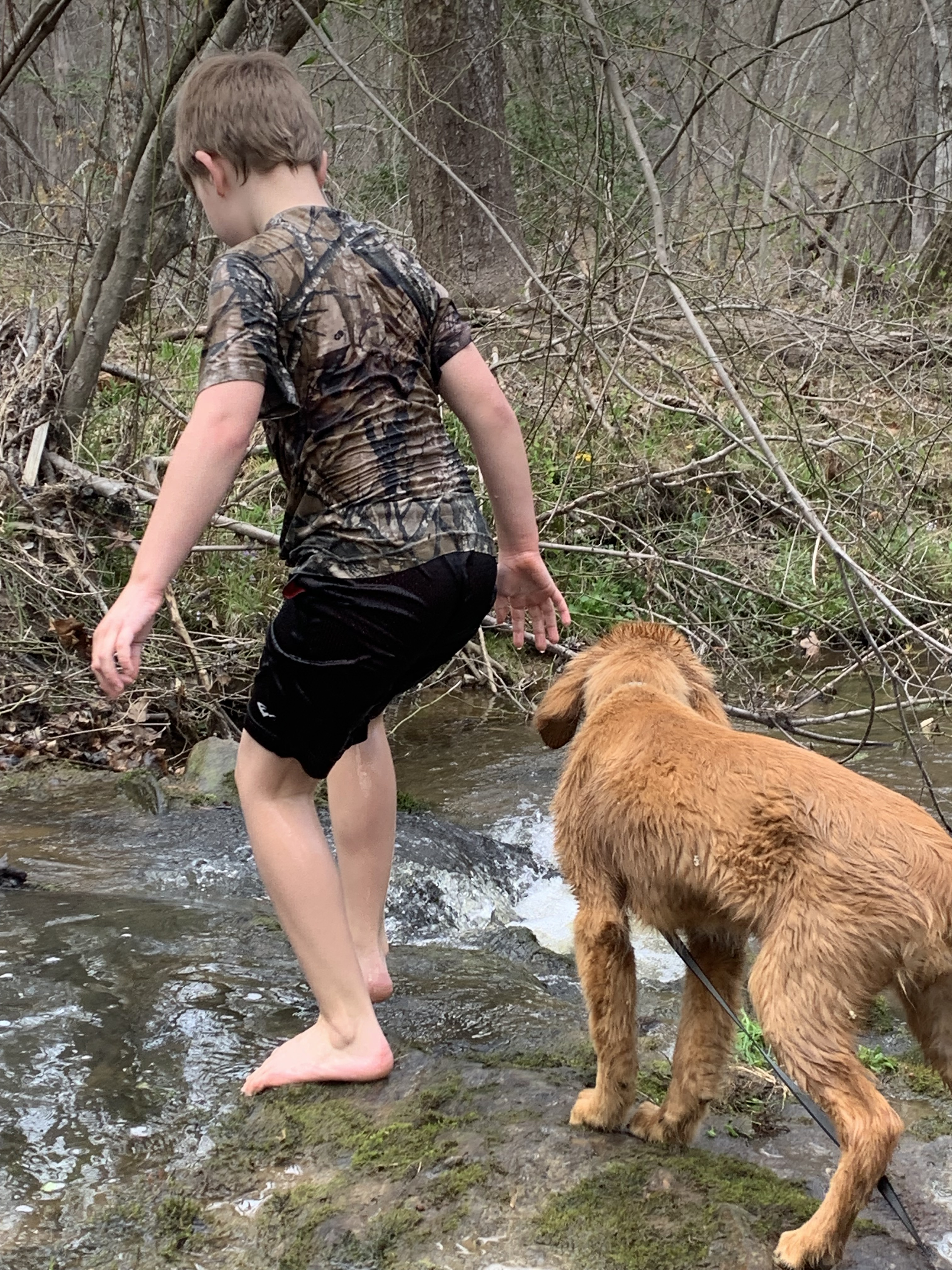 After getting dressed and waiting outside with the dogs for 15 minutes, Mom and Dad are finally ready! It was quite comical how differently we all dressed; Mom and Dad were in their heaviest coats, gloves, and hats (as was PJ), while I was dressed in a fleece! As we hike in the woods PJ, Boaz, Ruth, and I raced ahead while Mom and Dad hiked behind. Boaz, Ruth, and I excitedly run to the creek and soon we are splashing in the water and frolicking in the sand. After about 20 minutes, we continue our hike until we reach the field and then Ruth and I run all the way back to the house and wait for PJ, who eventually catches up, and for Mom and Dad, who are further behind.