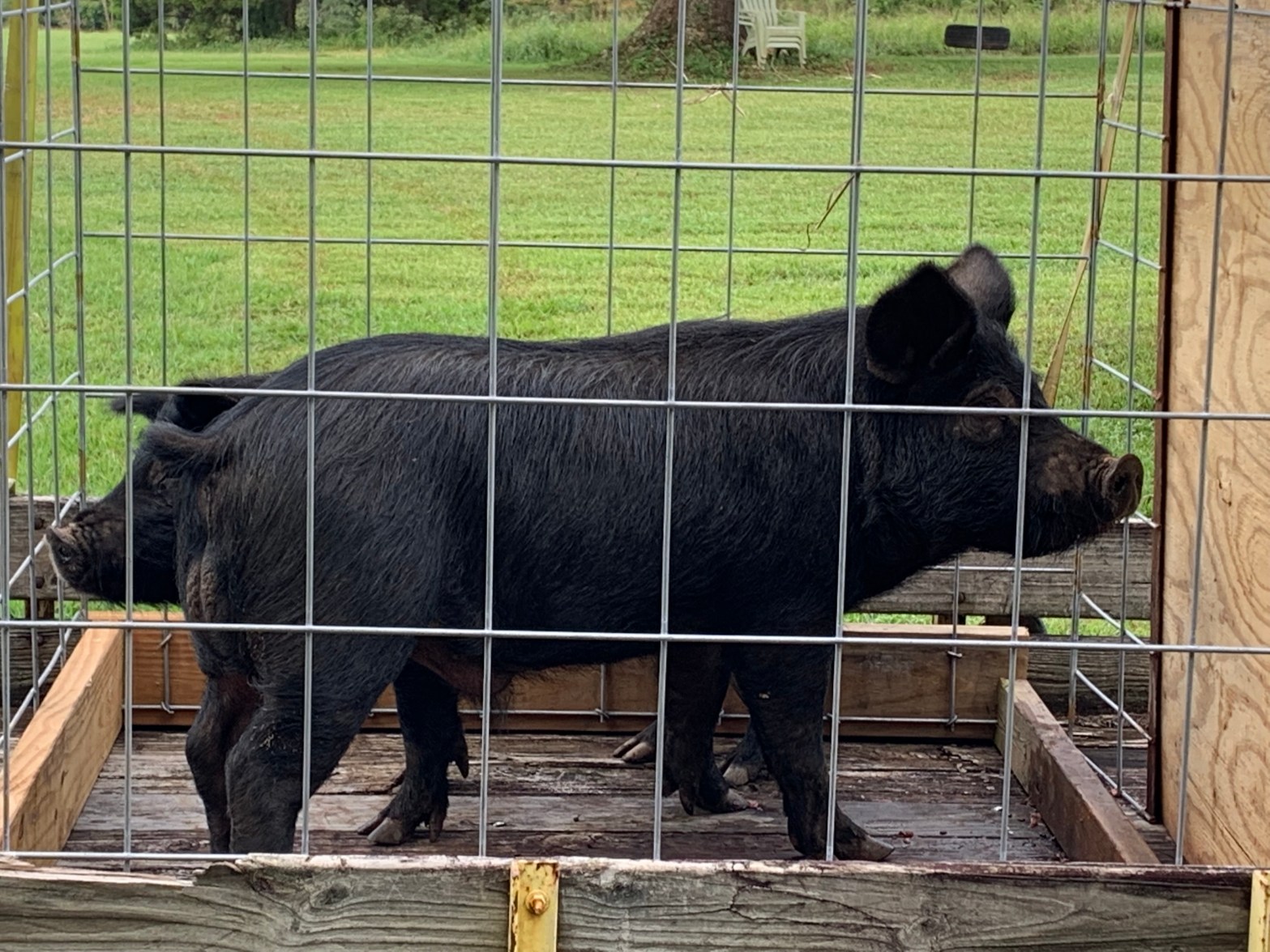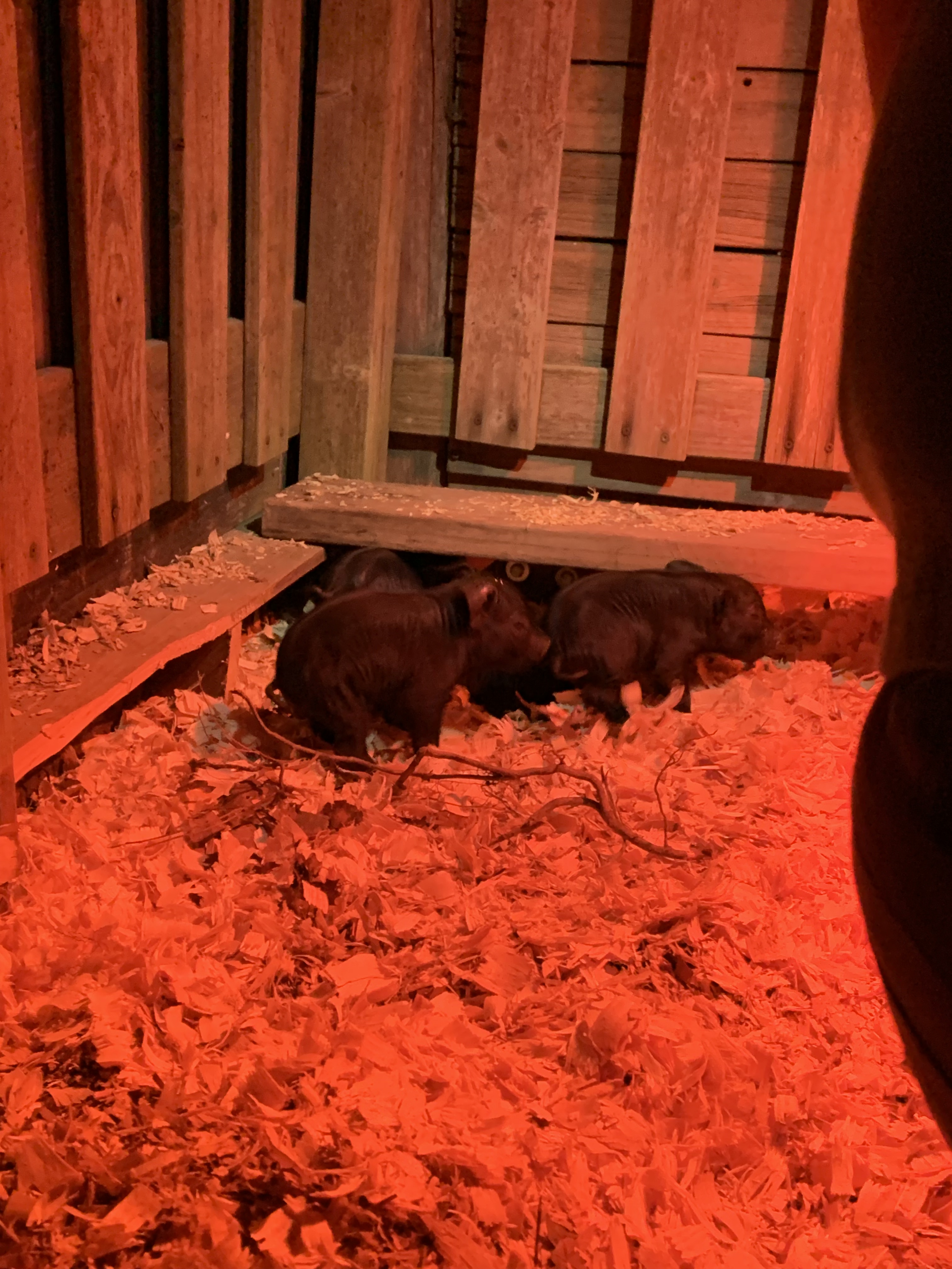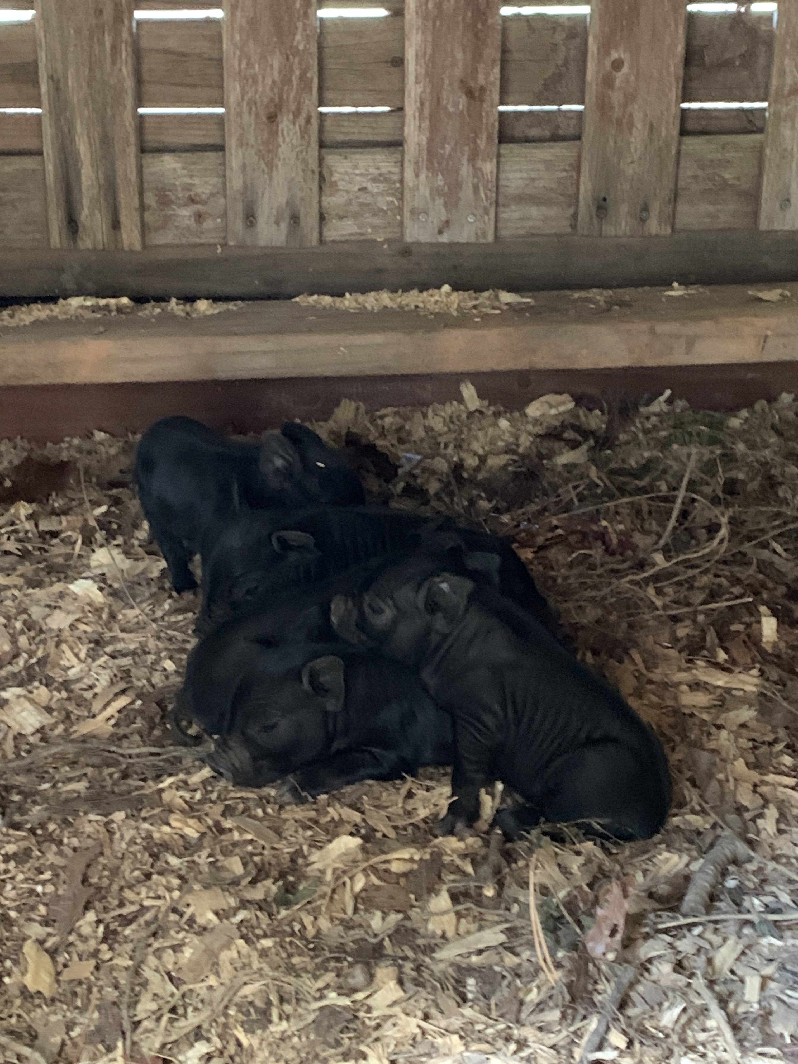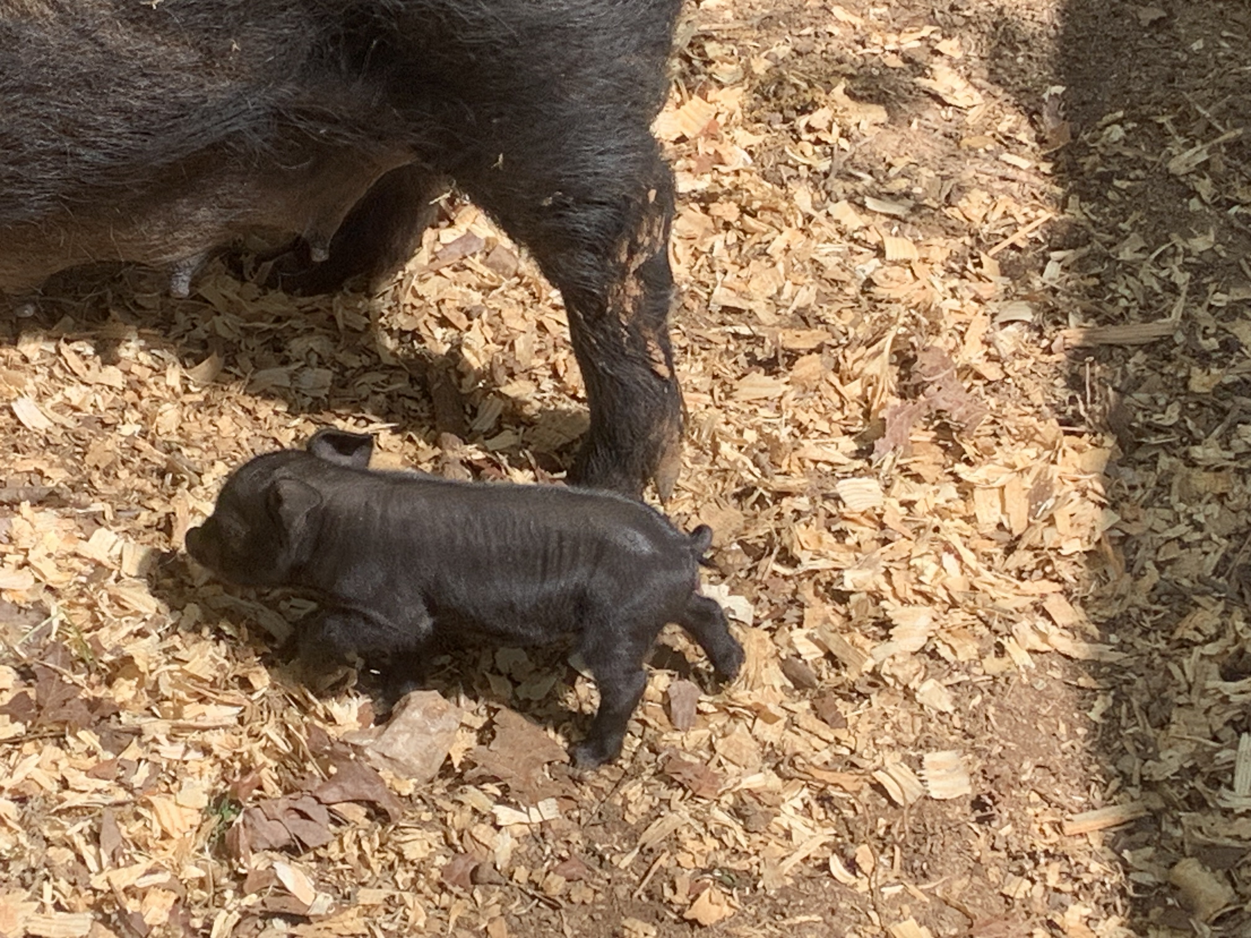 “Hi”, it’s P.J. again and I’m going to tell you about our piglets, but first, here are some facts about American Guinea Hogs (AGH). They came from the United Kingdom and Africa. Their weight is: 150 – 300 pounds, height: 22 – 27 inches, 46 – 56 inches in length. Their lifespan is 15 – 20 years. Usually slaughtering takes place at 6 months for adults. The AGH is usually docile and nonaggressive. A tarp is a good shelter along with a wooden house. They need straw to bed down in. Electric wire runs around their space because they are curious and it trains them not to escape. The electric fence is on the outside, just in case the wire doesn’t stop them. Sue, our pregnant sow needs 6 – 7 gallons of water each day and we feed her twice a day.