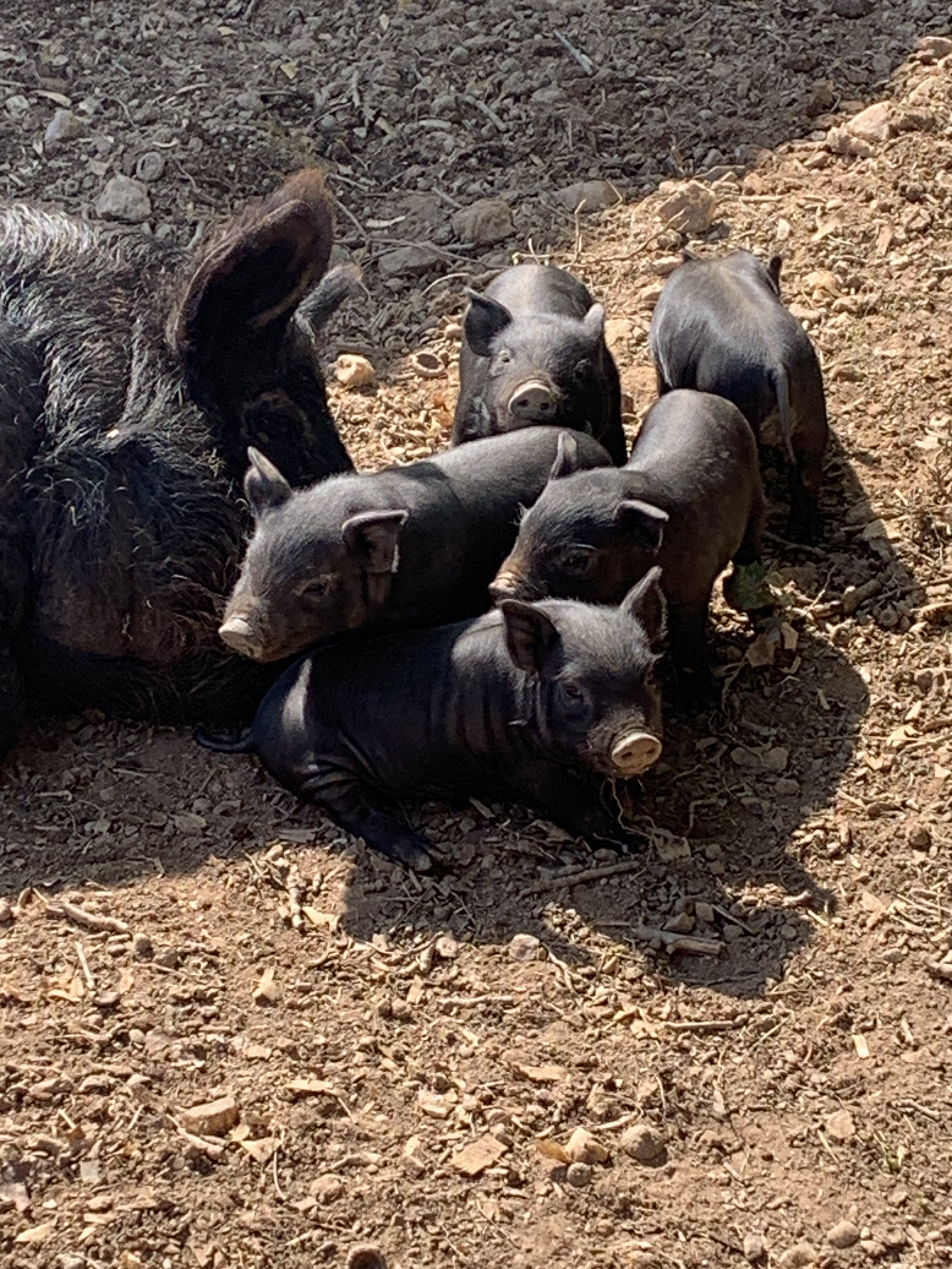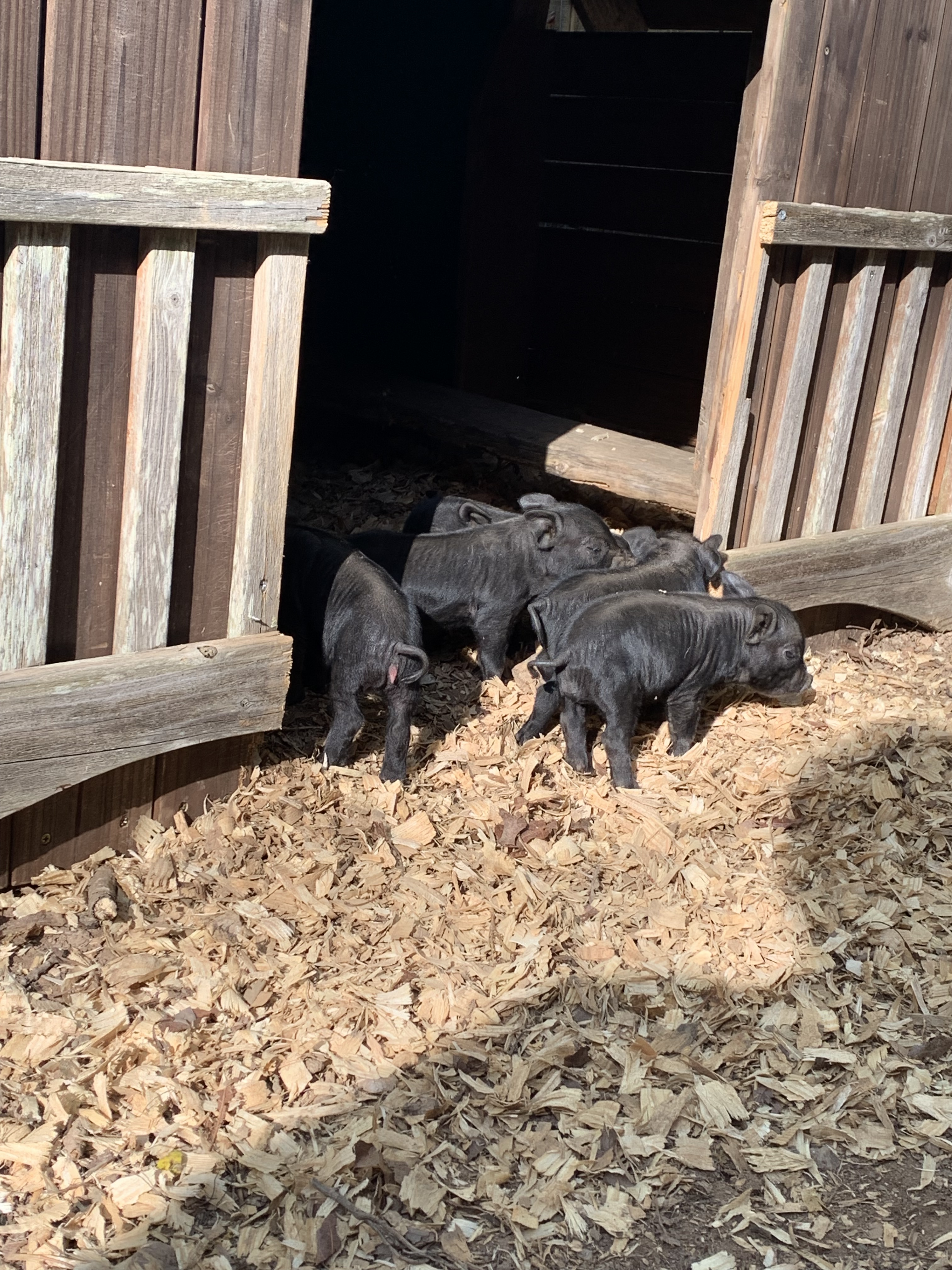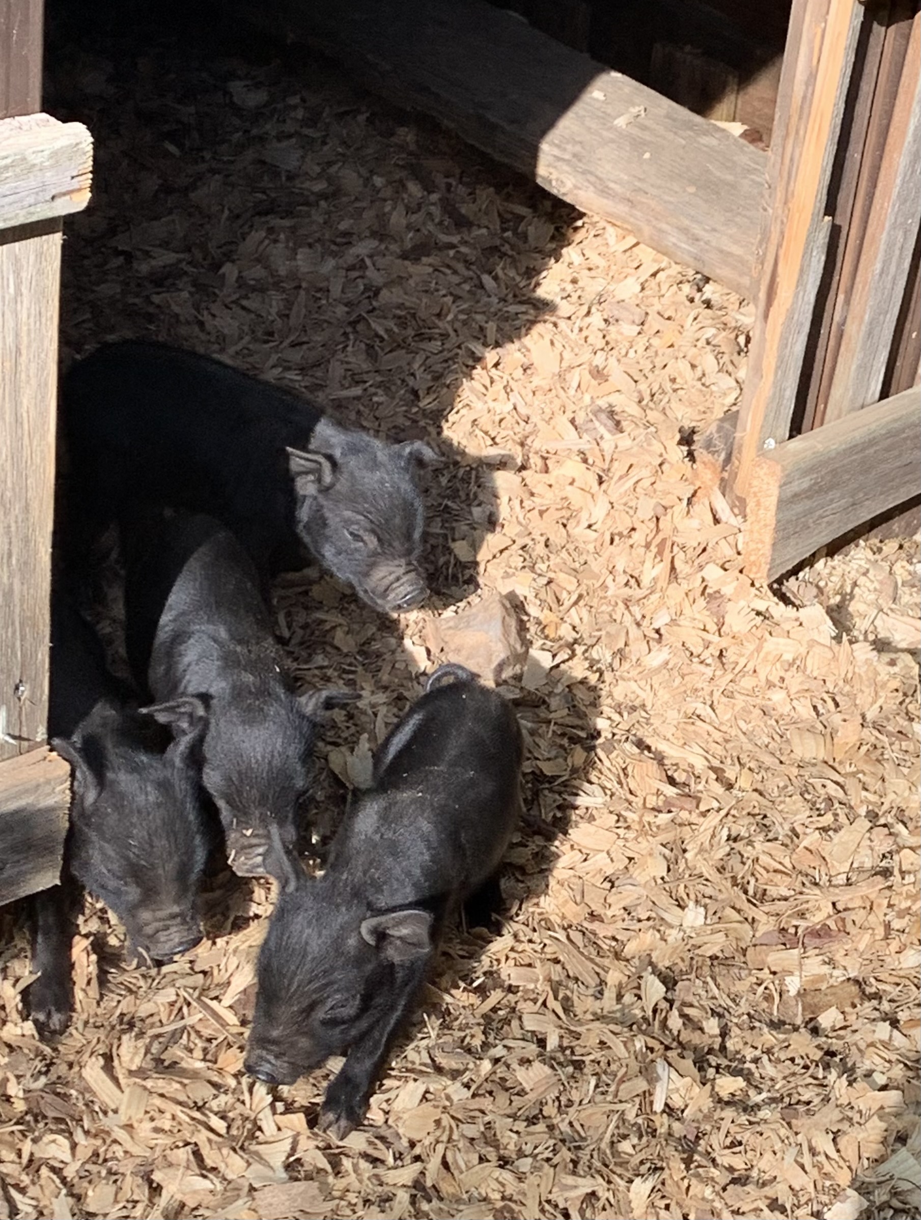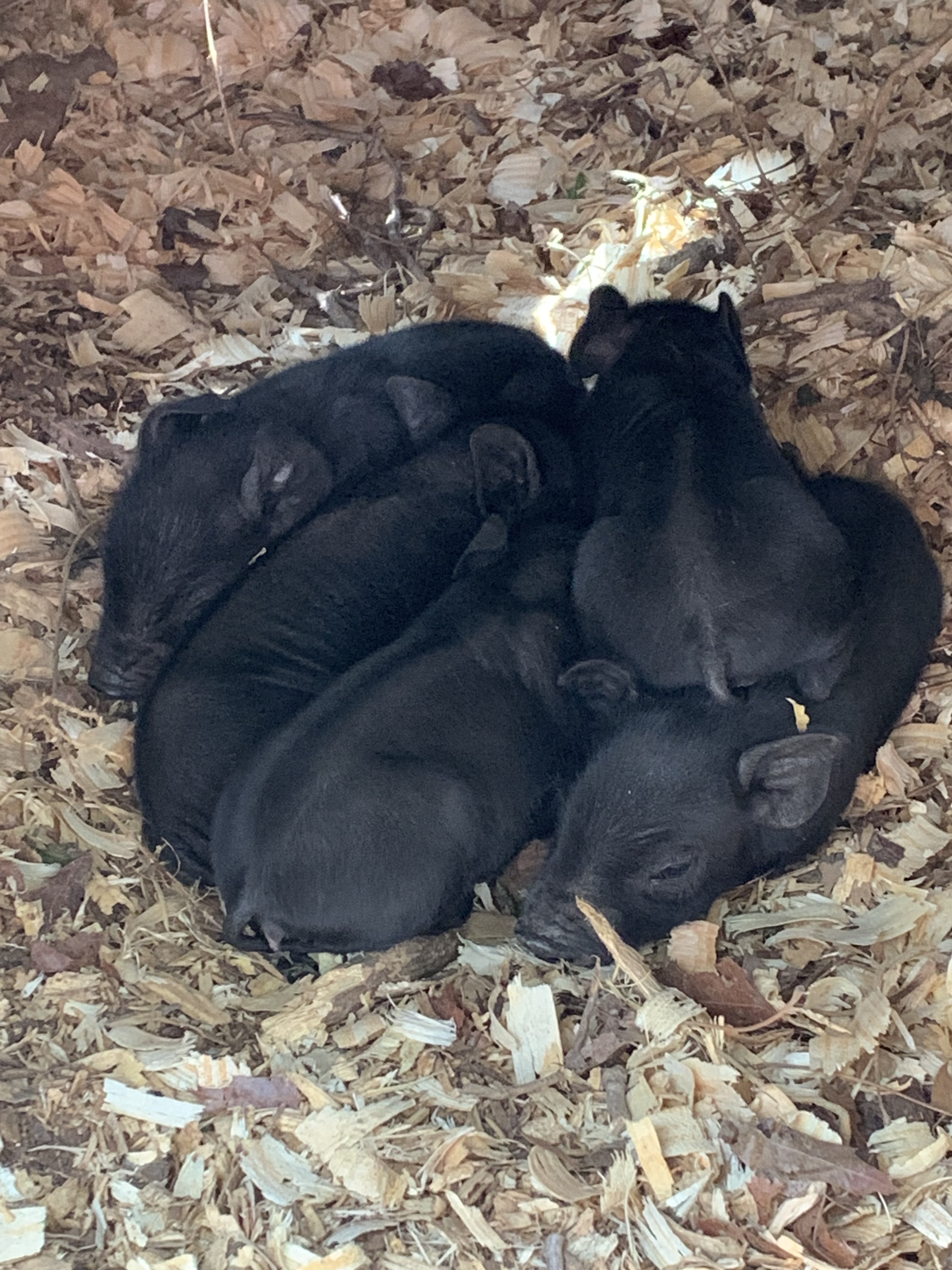 “Hi”, it’s P.J. again and I’m going to tell you about our piglets, but first, here are some facts about American Guinea Hogs (AGH). They came from the United Kingdom and Africa. Their weight is: 150 – 300 pounds, height: 22 – 27 inches, 46 – 56 inches in length. Their lifespan is 15 – 20 years. Usually slaughtering takes place at 6 months for adults. The AGH is usually docile and nonaggressive. A tarp is a good shelter along with a wooden house. They need straw to bed down in. Electric wire runs around their space because they are curious and it trains them not to escape. The electric fence is on the outside, just in case the wire doesn’t stop them. Sue, our pregnant sow needs 6 – 7 gallons of water each day and we feed her twice a day.