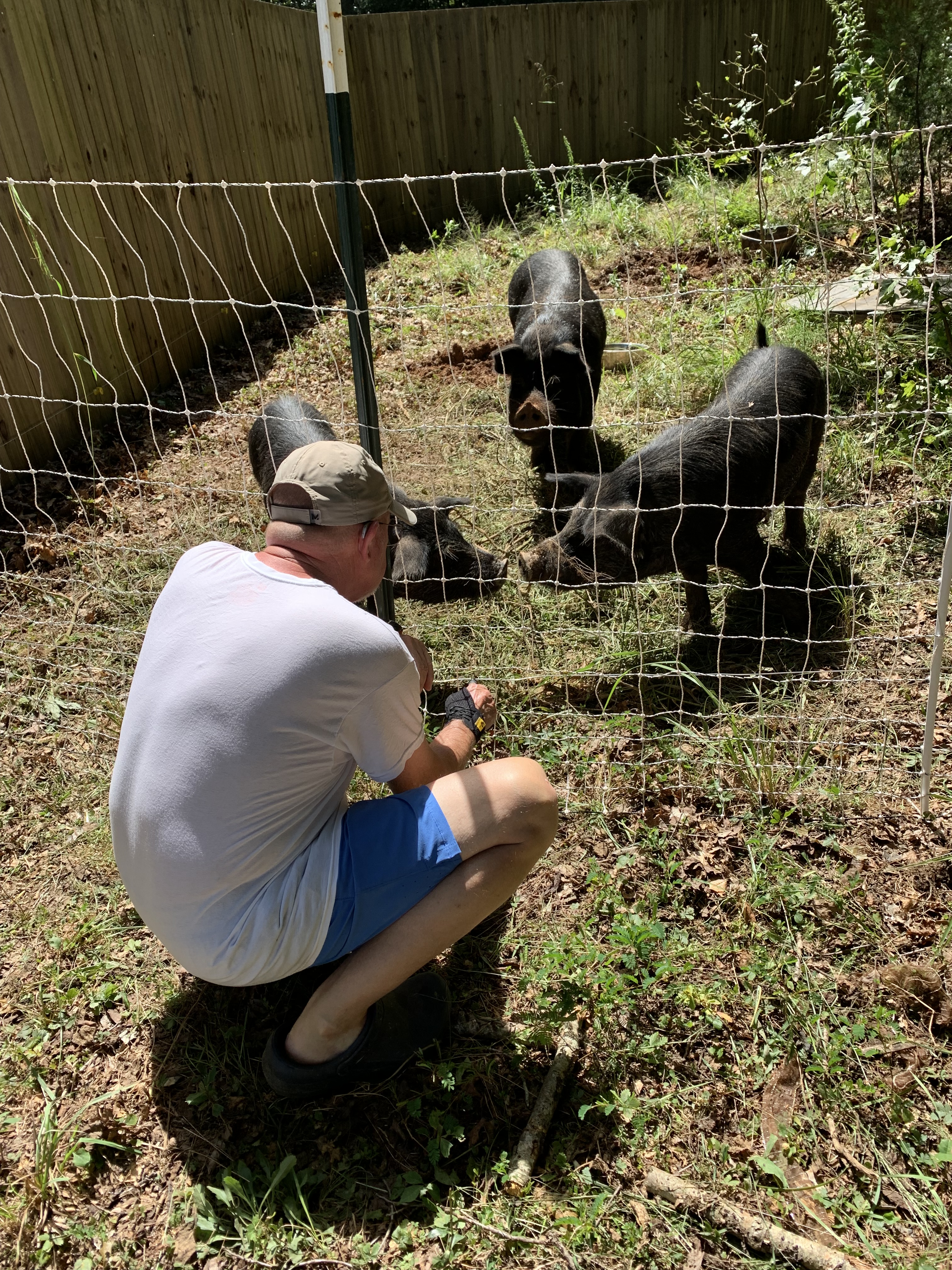 “Hey Dereck, what are your plans for the pigs?” asked Nana.” I was hoping you would take them,” Mr.Derek replied. We were having Miss. Annie and Mr. Derek over for dinner. Dad said, “We’ll take them in!” But we needed a little time to set up the electric fence. Soon we were ready, so on the next weekend Derek brought the girls over (Dotty and Sue), and his son Walter. We put the sows into the electric fenced in area. The boys were a little harder. There was one bore (Sausage) that was being stubborn, but we finally got them all. There are 4 boars and two sows. The Boars are: Larry, Sausage, Bacon, and Pinocchio.