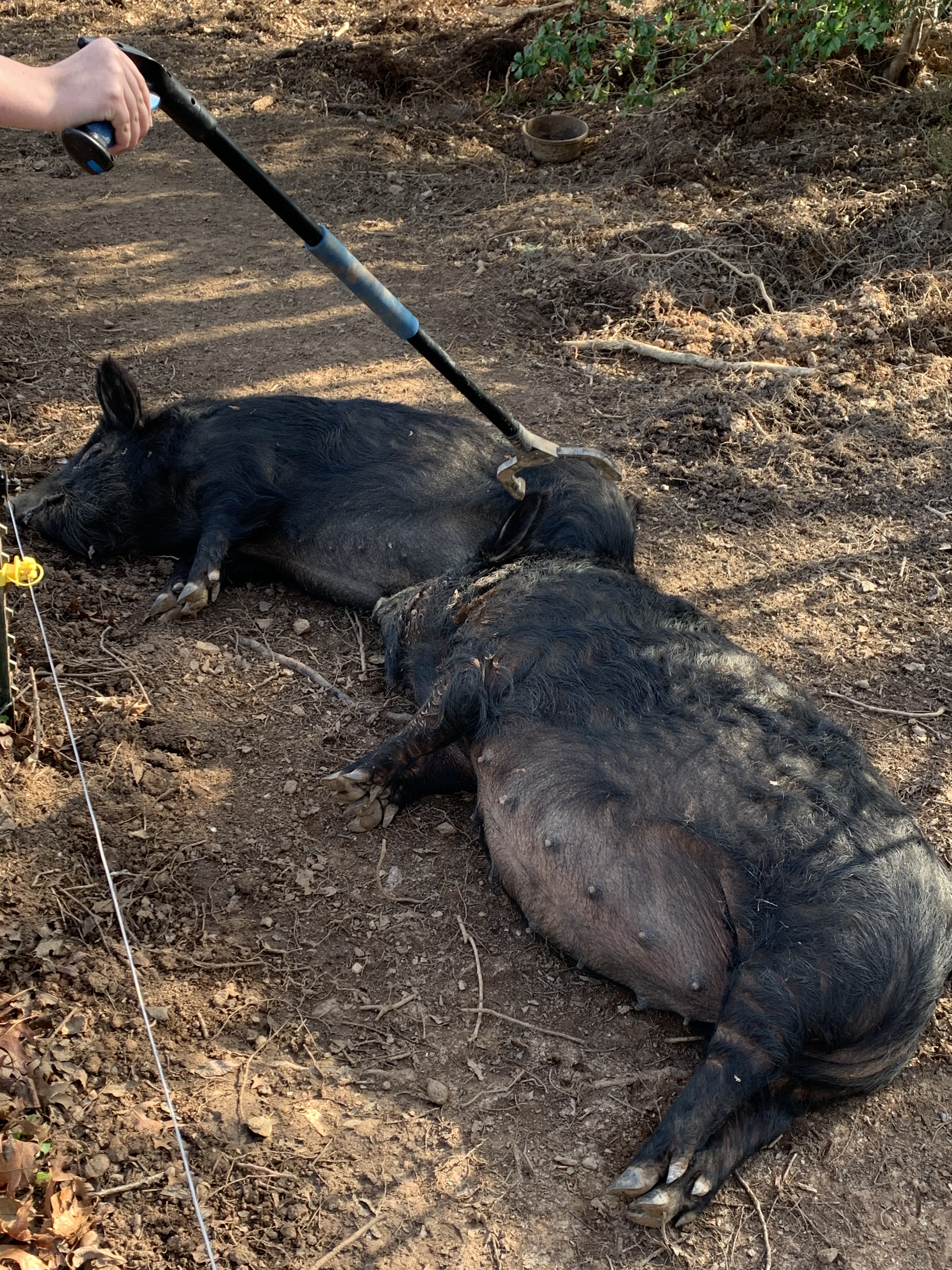 We get food for the pigs at the Louisa Food Bank, a local restaurant, our garden, the feed store, and Nana also cooks rice, beans, and oatmeal from our pantry. It cracks me up whenever we walk out to the front pigpen because the sows roll over on their sides to be rubbed. When they stand, you can see their bellies are almost touching the ground because they are both pregnant. We are going to have piglets soon and new born piglets are the size of soda cans with legs. Raising pigs is a mind-blowing experience.